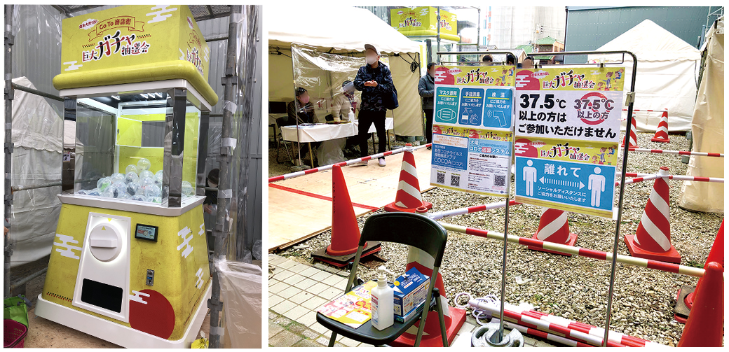 商店街では大阪府の感染症対策等支援事業に参画し、「みんなで守ろう。おおさか」がスローガンののぼりやポスターを掲出し、いつも以上に感染予防に気をつけました。抽選会場入口では全ての来場者に検温を実施し、アンケート記入スペースや抽選券の受付場所にはアクリル板を設置しました。「巨大ガチャ」のハンドル部についてはお客さんが回した後1回ごとに消毒を徹底。そのおかげで安全安心が確保され、抽選会では、3600ガチャを記録。イベントは大成功を収めました。これからも商店街を中心とした地域の魅力を発信できるように、岸和田駅前通商店街の挑戦は続きます。