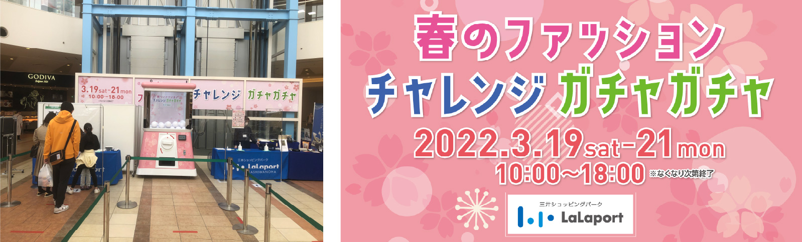 三井不動産商業マネジメント株式会社(所在:東京都中央区、代表取締役社長:大林 修)が運営する、三井ショッピングパーク ららぽーと柏の葉にて、2022年3月19(土)~3月21日(月)の期間、春のファッション チャレンジ ガチャガチャでにおいて、巨大ガチャ「モンスターカプセル」を設置させて頂きました。2022年3月設置したららぽーとTOKYO-BAYに続いて2店舗目の導入になります。