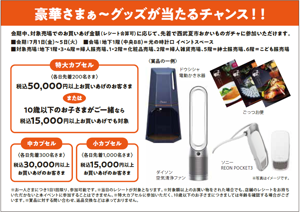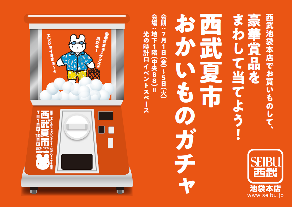 概 要:会期中、対象売場でのお買いあげ金額(レシート)に応じて、先着で西武夏市おかいものガチャに参加いただける